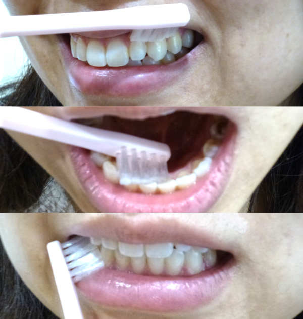 具体的な磨き方は、つまようじを使うように歯ブラシを歯間部(歯と歯の間)に挿入し、10回ほど出し入れを繰り返します。